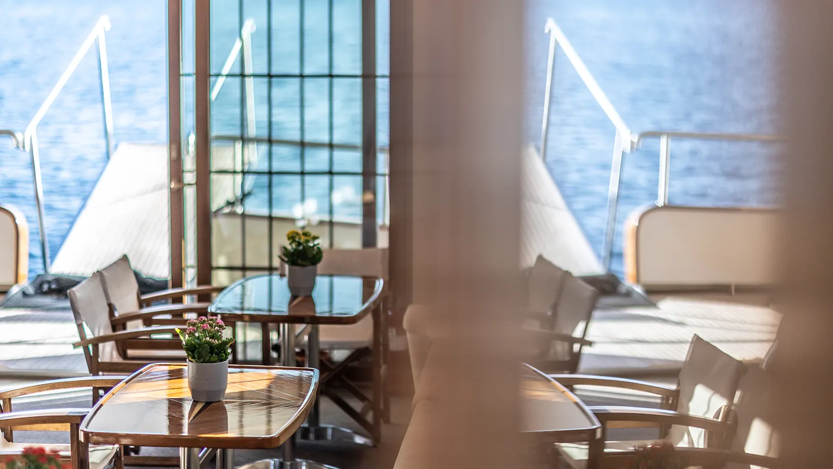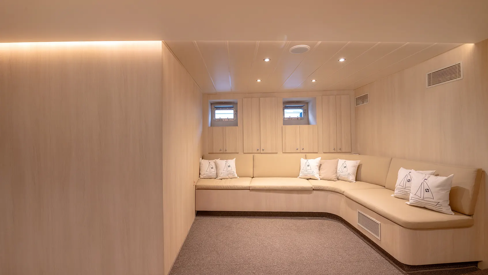 Inside, guests can relax in two generous lounges (105 sqm), while the expansive outdoor decks (210 sqm) feature two fully equipped bars, plenty of seating, and sunbathing areas.